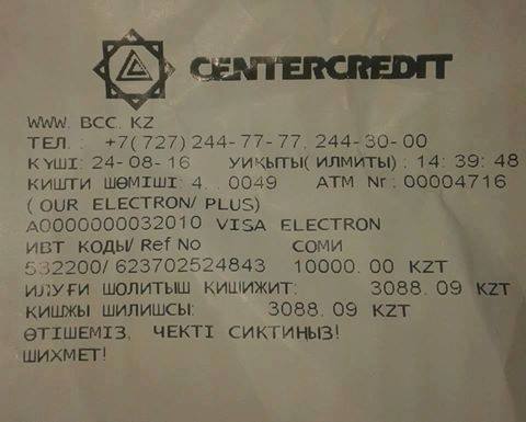 Из этого чека едва можно понять, о чем идет речь. Слово "время" переведено как "уикыты (илмиты), сумма как "соми", а напротив суммы вовсе непонятная фраза - "илуги шолитыш кишижит", внизу на чеке написано слово, напоминающее нецензурную фразу на казахском языке. А вместо "рахмет" (спасибо) Банк ЦентрКредит использует "Шихмет", значение которого тоже разобрать не удалось.