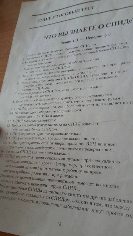 "С момента появления заболевания СПИД я веду просветительскую работу и посещаю курсы. Проблеме уделяется много внимания уже больше 30 лет. У нас в городе ведется активная работа против распространения этого заболевания, и наша школа постоянно в ней участвовала - проводилась агитация, семинары. Эта тема у нас всегда открыта, и никогда не вызывала никаких вопросов. Тест я получила на одном из курсов ЮНЕСКО в 2006 году. Он был рекомендован для работы с детьми. Я его проводила, но вопросов это не вызывало", - сказала она.