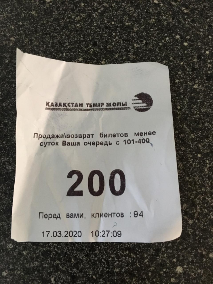 "Талон берешь, там написано, что перед вами 100 человек. Вчера моя очередь подошла, но мне сказали, что я не в приоритете, потому что сейчас сдают те, у кого билет на ближайшие сутки. Но очень медленно работают кассы. За пять часов обслуживается только 30 человек. Все сейчас пытаются изолироваться, но то, что здесь образовалось, я считаю чем-то нехорошим", - говорит алматинец.