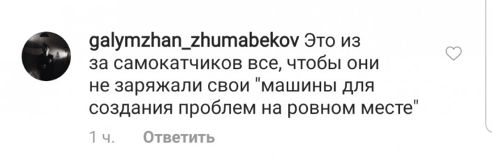 "Это из-за самокатчиков все, чтобы они не заряжали свои "машины для создания проблем на ровном месте", - не проходит мимо актуальной темы galymzhan_zhumabekov.