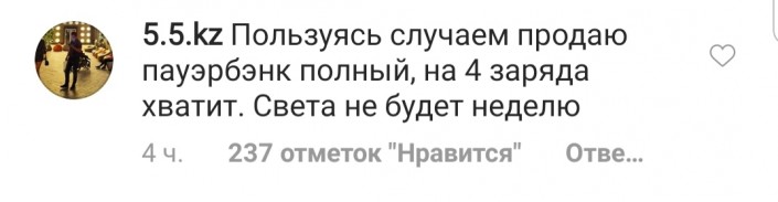"Пользуясь случаем, продаю power bank полный, на четыре заряда хватит. Света не будет неделю", - шутит другой житель Алматы 5.5.kz.