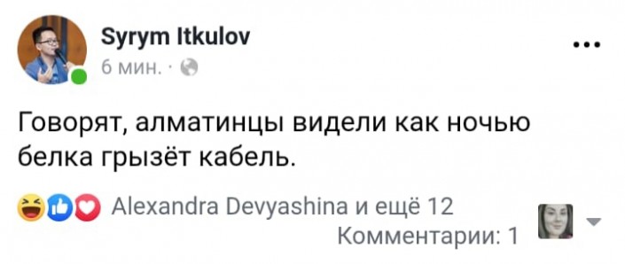 "Говорят, алматинцы видели, как ночью белка грызет кабель", - пишет на своей странице в Facebook Syrym Itkulov.