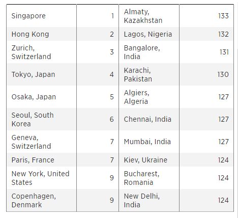 Самым дорогим городом для жизни четвертый год подряд становится Сингапур. Второе место у Гонконга, а замыкает тройку швейцарский Цюрих. В ТОП-10 рейтинга также вошли Токио, Осака, Женева, Париж, Нью-Йорк и Копенгаген.