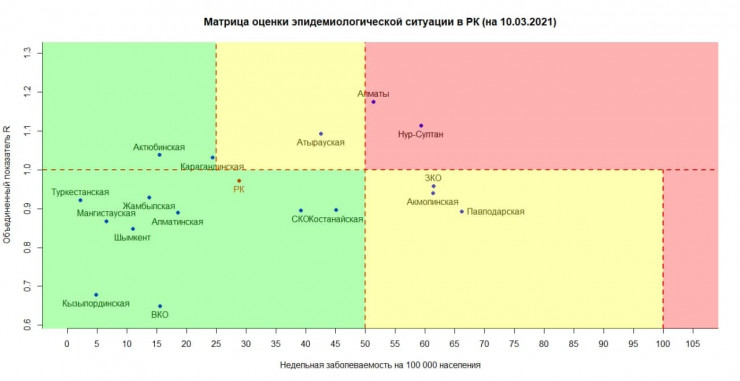 В "желтой" зоне - Акмолинская, Западно-Казахстанская, Атырауская, Павлодарская области.