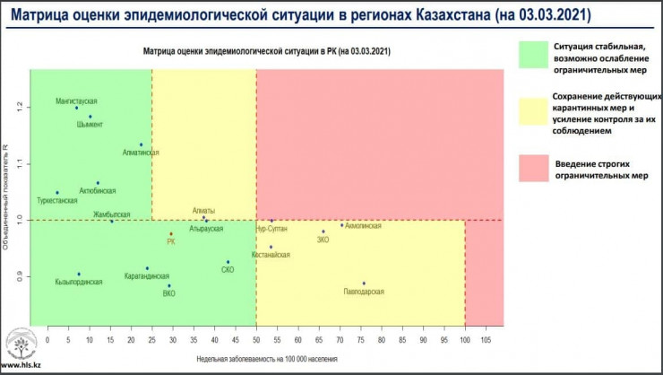 Сообщается, что в "желтой" зоне также находятся Нур-Султан, Акмолинская, Западно-Казахстанская, Костанайская, Павлодарская области.