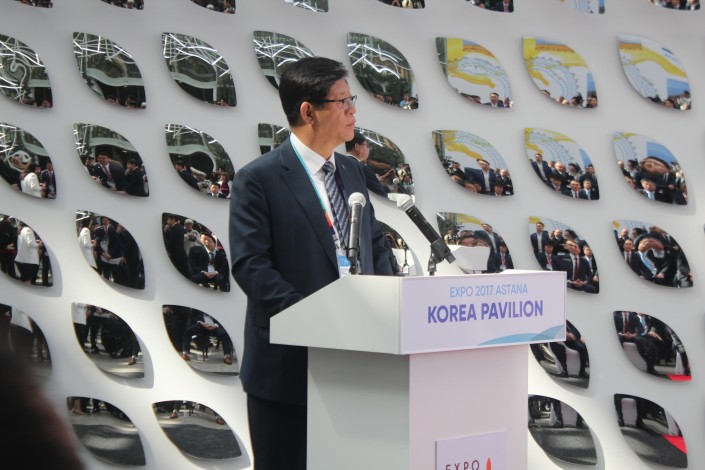 "Павильон Кореи является самым большим на выставке. Тематикой является "Энергия будущего. Умная жизнь". В нашем павильоне вы отправитесь в путешествие семян энергии, которые покажут вам энергию будущего. Мы представили наши новейшие разработки, технологии в области солнечной энергетики, ветряной энергетики. Также мы привезли технологии по сохранению энергии. Вы сможете увидеть очень интересную историю любви между казахским юношей и корейской девушкой и насладиться культурными мероприятиями", - рассказал во время выступления на торжественной церемонии Ким Джэ Хонг.
