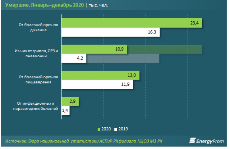 "От болезней органов дыхания, по официальным данным, за 2020 год умерли 23,4 тысячи человек. Это сразу на 43,4 процента больше по сравнению с аналогичным периодом прошлого года", - пишут аналитики.