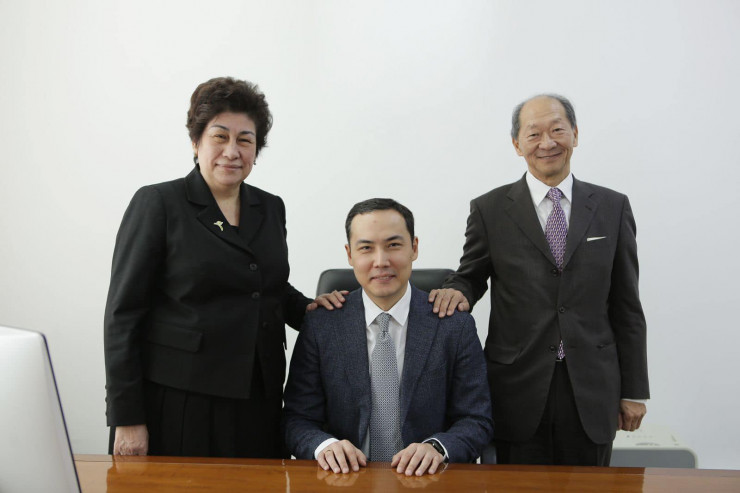 На фото Ануар Жангозин вместе с экс-председателем НИШ Куляш Шамшидиновой и ректором Назарбаев Университета Шигео Катсу.