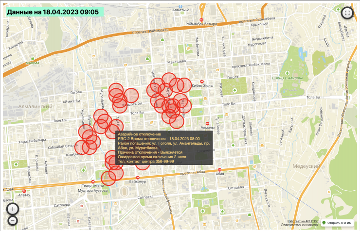 Согласно интерактивной карте "Алатау жарык компаниясы" (АЖК), отключение электричества произошло в квадрате улиц Гоголя - Абая - Муканова - Желтоксан.