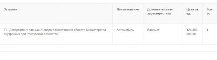 На сайте государственных закупок появился лот №5419874-1 на покупку автомобиля с водометной установкой для ДП СКО. Цена лота – 124 800 000 тенге, передает Tengrinews.kz со ссылкой на Петропавловск.news.