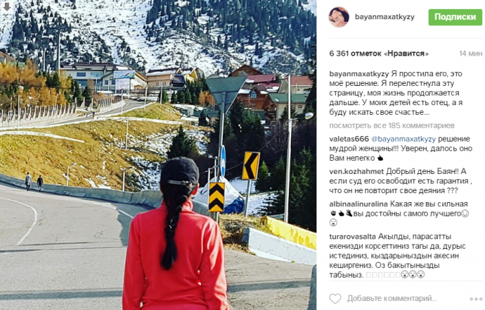 "Я простила его, это мое решение. Я перелистнула эту страницу, моя жизнь продолжается дальше. У моих детей есть отец, а я буду искать свое счастье..." - написала Баян Максаткызы.