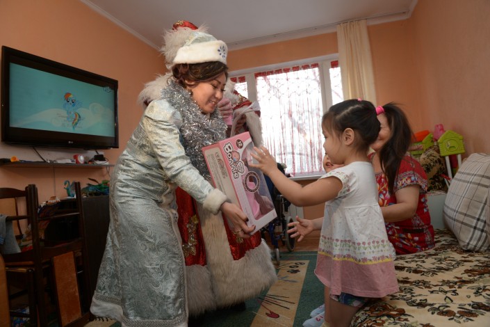 Аружан Бейсеевой, обожающей математику, Дед Мороз подарил  современный планшет и годовой абонемент на обучение ментальной арифметике. Также дети получили планшеты, велосипеды, ноутбуки, годовые абонементы в бассейн и спортивные залы, школьные парты, телевизор, методики раннего развития, развивающие игрушки, аргамаки, санки, кукольные дома и другие подарки. Всего подарки от акима Алматы получил 71 ребенок.