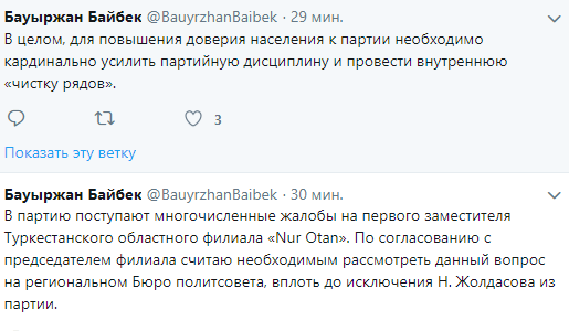 "По согласованию с председателем филиала считаю необходимым рассмотреть данный вопрос на региональном Бюро политсовета, вплоть до исключения Нурмахана Жолдасова из партии. В целом для повышения доверия населения к партии необходимо кардинально усилить партийную дисциплину и провести внутреннюю "чистку рядов", - написал Бауыржан Байбек.