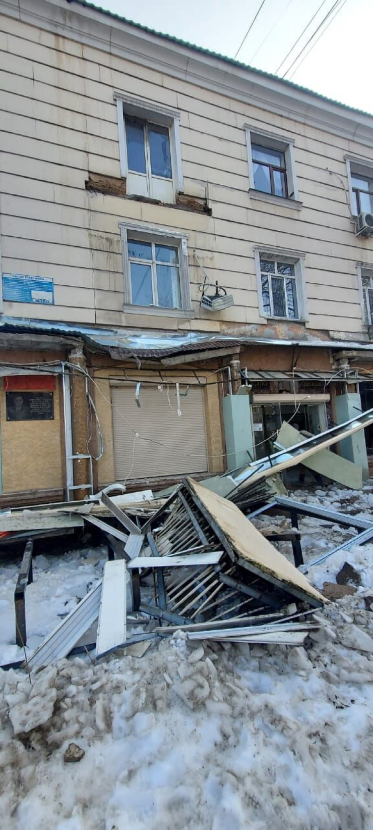 Падающий балкон снес кондиционер на втором этаже и повредил козырек на первом. Обломки упали на площадку перед домом.
