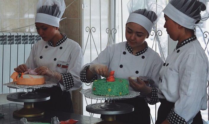 Студенты Колледжа индустрии туризма и гостеприимства Алматы по программе. Цех кондитеров.