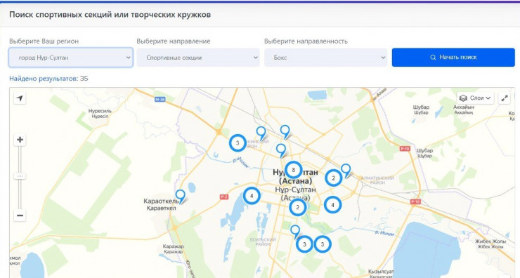 Для удобства при поиске нужной секции открывается карта Казахстана. Нужно выбрать свой регион и необходимую секцию. Результаты поиска отобразятся на карте в виде меток поставщиков. Вы можете выбрать нужного вам поставщика и перейти в его профиль.