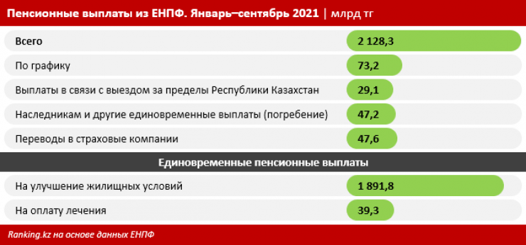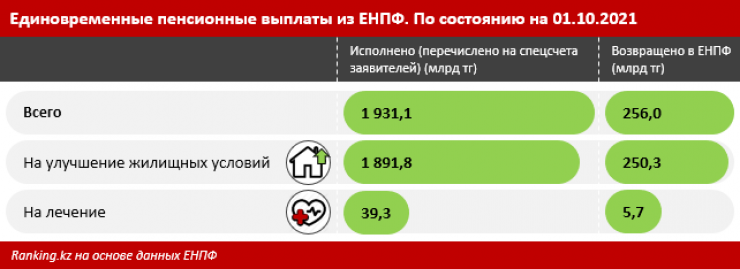 На 5 ноября 2021 года Единым накопительным пенсионным фондом исполнено 491,1 тысячи заявлений вкладчиков (получателей) на использование пенсионных накоплений для улучшения жилищных условий. На спецсчета казахстанцев, открытые в банках - уполномоченных операторах, ЕНПФ перевел почти два триллиона тенге. Средняя сумма единовременных пенсионных выплат составила четыре миллиона тенге. Больше всего исполненных заявлений направлено жителями Алматы (17 процентов), Мангистауской области (13,5 процента) и Нур-Султана (13 процентов).
