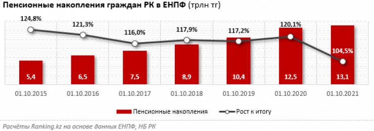 К 1 октября 2021 года пенсионные накопления граждан в Едином накопительном пенсионном фонде страны достигли 13,1 триллиона тенге  - на пять процентов больше, чем в аналогичном периоде предыдущего года.