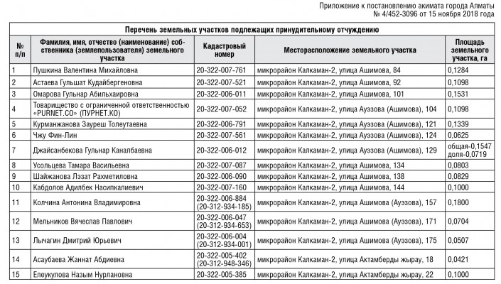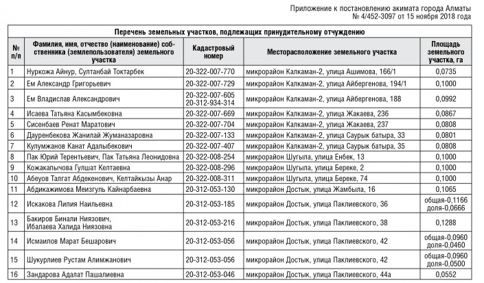 На сайте газеты "Вечерний Алматы" опубликовали список жителей, чьи земельные участки или иное недвижимое имущество подлежат принудительному отчуждению в связи с изъятием земельных участков для государственных нужд, сообщает Тengrinews.kz.