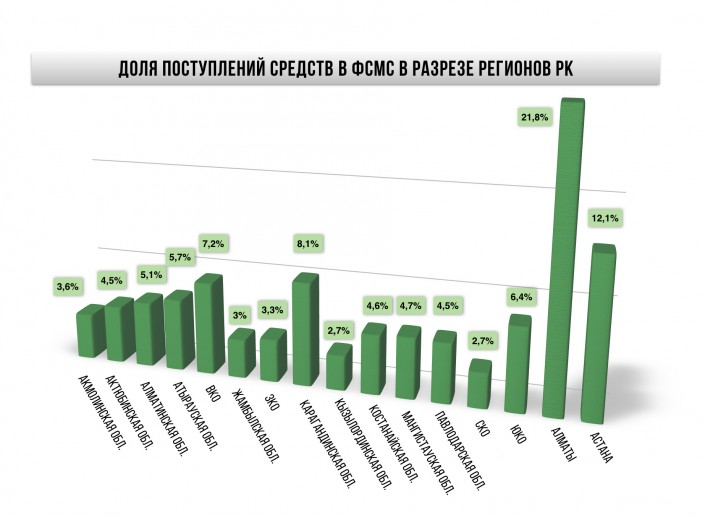 "В разрезе регионов наибольшие суммы по-прежнему поступают из городов Алматы и Астана, а также из Карагандинской и Восточно-Казахстанской областей. По итогам года показатели превысили прогнозные ожидания Фонда социального медицинского страхования. Напомним, что прогноз поступлений по ОСМС на 2017 год составлял порядка 30 миллиардов тенге", - прокомментировали в Фонде.