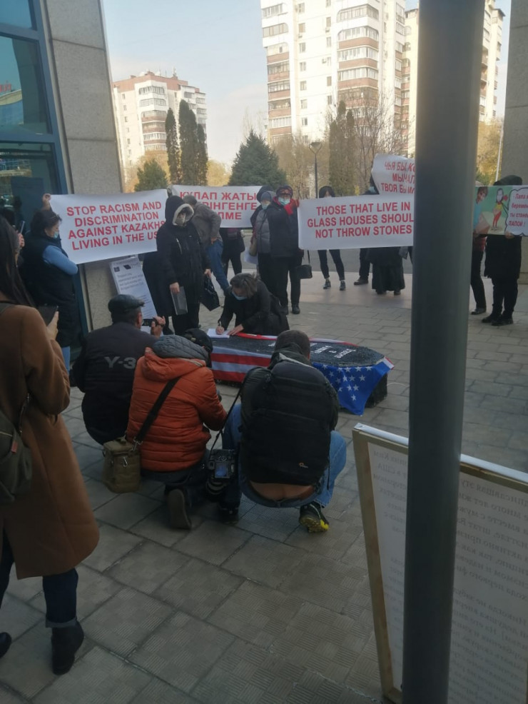 У здания генконсульства собралось около 20 активистов. На плакатах, которые они принесли, написано: "Чья бы корова мычала", "Пусть прекратят оскорблять казахов, которые живут в Америке" и так далее.