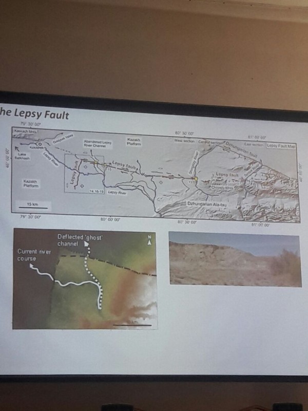Он продемонстрировал собравшимся так называемый "Лепсинский разлом" недалеко от поселка Лепсы и гор Джунгарского Алатау. Сдвиг тектонических плит, по данным ученых, в этом случае составляет около десяти метров. "Когда произошло землетрясение, изменился канал реки Лепсы. Исследовав отложения в старом русле, нам удалось выяснить, что землетрясение произошло около 400 лет назад. Удивительно, но мы не видим никаких исторических записей о событии. Потенциально речь может идти о землетрясении 1716 года. В оригинальной исторической записи описаны разрушения в районе озер Балхаш и Зайсан, а также в городе Аксу в Китае. Но я не думаю, что это что-то, что мы можем сказать с абсолютной уверенностью", - пояснил ученый.