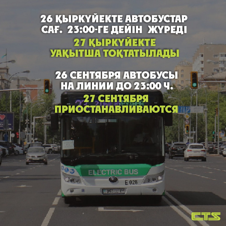 "В воскресенье, 27 сентября, движение автобусов в Нур-Султане будет временно приостановлено на один день. Это связано с проведением дезинфекционных работ", - говорится в сообщении.