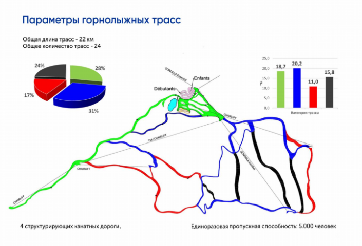 Предлагаемая концепция организации курорта опирается на два сегмента: "Долина" будет тщательно обустроена и предназначена для различных видов деятельности в течение всех четырех сезонов года, а центр "Кумбель" останется в своем естественном, нетронутом состоянии.