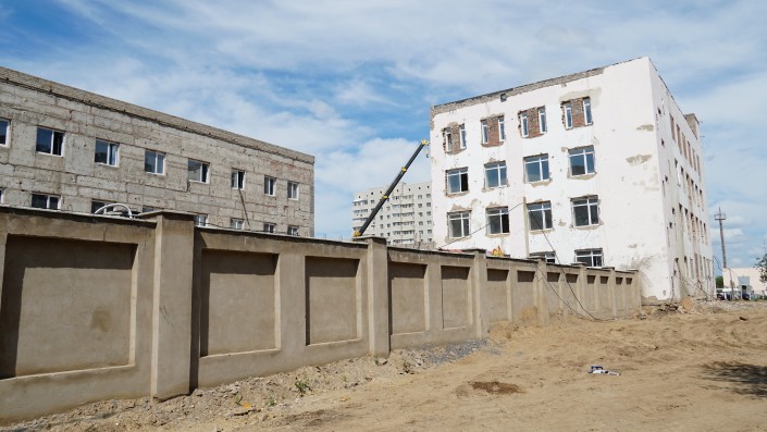 Здание уже огородили высоким забором, который по улице Кумисбекова зацементировали, а по Сейфуллина еще нет.