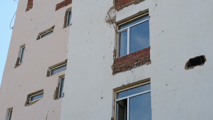 На первом этаже старого здания строители заложили окна, а на других этажах заменили деревянные оконные рамы на пластиковые.