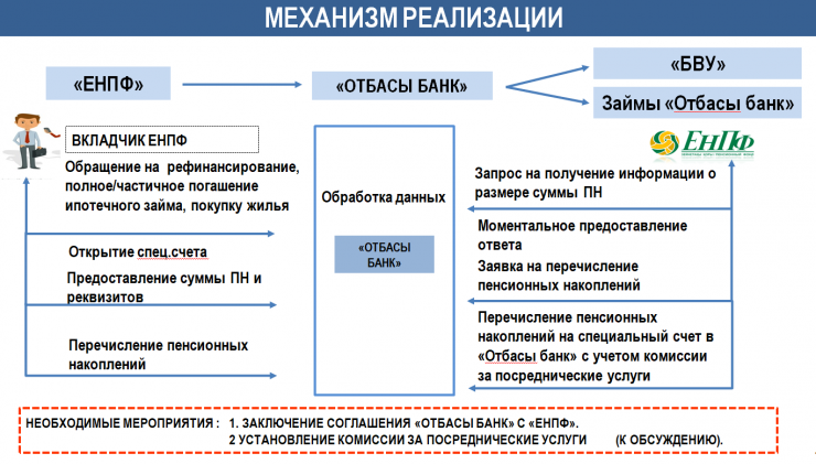 Из предоставленного пресс-службой Сената слайда видно, что даже если вкладчик хочет оформить ипотеку в другом банке, ему все равно будет необходимо сначала обратиться в "Отбасы банк". По данным МИИР, вопрос об установке комиссии банка за посреднические услуги находится на обсуждении.