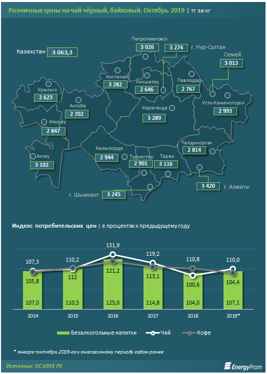 Сообщается, что в январе-октябре 2019 года чай подорожал, по сравнению с аналогичным периодом прошлого года, сразу на 10 процентов, а кофе - на 4,4 процента. Черный байховый чай в октябре текущего года стоил в среднем 3063,3 тенге за килограмм - на 6,8 процента дороже, чем в октябре 2018 года.