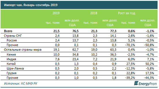 Импорт чая вырос в натуральном выражении на 0,6 процента за год и составил 21,5 тысячи тонн за три квартала текущего года. В денежном выражении, напротив, импорт сократился: минус 1,1 процента. Основные поставщики чая на казахстанский рынок - Кения, Индия и Россия. В Казахстане как в рынке для экспорта заинтересована также Великобритания.
