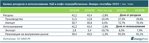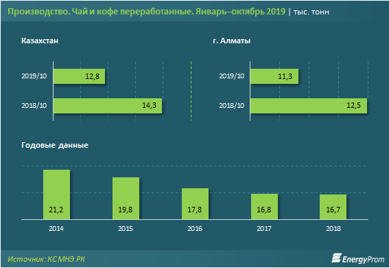 При этом объемы выпуска чая и кофе упали в Казахстане на 10,1 процента и составили 12,8 тысячи тонн против 14,3 тысячи тонн в 2018 году.