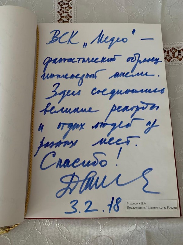 Одна из последних записей, оставленных в книге, принадлежит главе правительства России Дмитрию Медведеву. Запись была сделана зимой прошлого года.