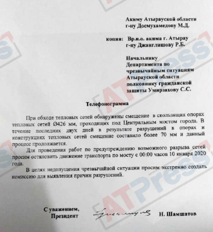 В распоряжении редакции издания оказалась телефонограмма за подписью президента АО "Атырауские тепловые сети" Нурадина Шамшатова. Она адресована акиму Атырауской области Махамбету Досмухамбетову, временно исполняющему обязанности акима города Ринату Джанглишову, а также начальнику ДЧС области Сагинбеку Умирзахову.