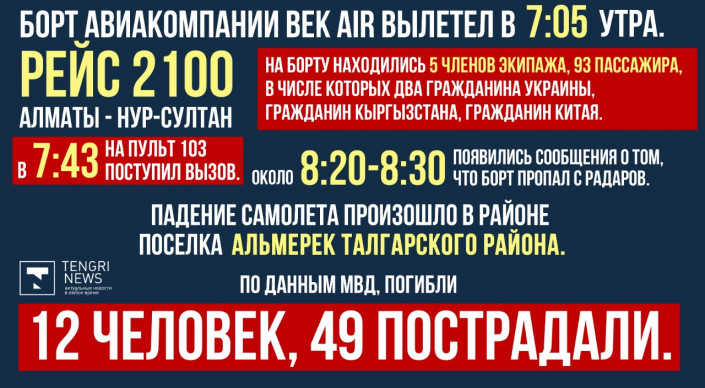 27 декабря борт авиакомпании Bek Air, следующий рейсом 2100 Алматы - Нур-Султан, вылетев по плану в 07.05, пропал с радара. На борту находились 93 пассажира и пять членов экипажа. Позже в Сети начали рассылать фотографии самолета, разбившегося за пределами аэродрома.