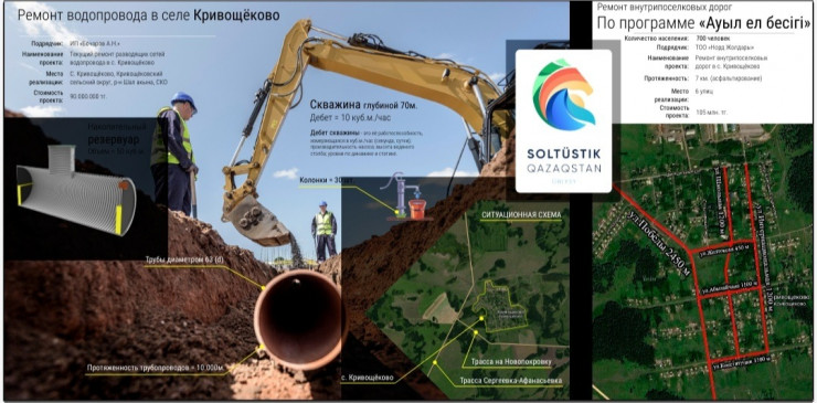 "Государство видит стремление агрария развивать село, поэтому параллельно мы улучшаем инфраструктуру села Кривощеково. Из бюджета направлено 214 миллионов тенге. В этом году заасфальтирована подъездная дорога до села, провели ремонт основных улиц. Установлено освещение на всех улицах, поставили детскую площадку и тренажеры. Сейчас проводится ремонт водопроводных сетей. Запланируем ремонт школы и сельского клуба", - сказал аким СКО Кумар Аксакалов во время встречи с жителями села Кривощеково района Шал акына.