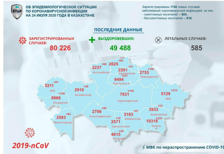 В Казахстане зарегистрировано еще 1740 случаев заражения коронавирусной инфекцией, передает Tengrinews.kz со ссылкой на Межведомственную комиссию по нераспространению COVID-19.