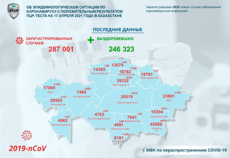 В Казахстане за прошедшие сутки (данные за 17 апреля) зарегистрировано 2828 новых случаев заболевания коронавирусной инфекцией, передает Tengrinews.kz со ссылкой на статистику МВК по нераспространению COVID-19.