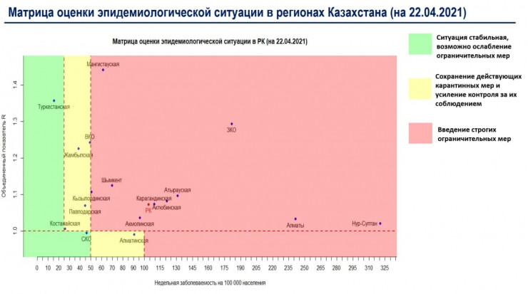 Сообщается, что в "красной" зоне остаются Нур-Султан, Алматы, Шымкент и Акмолинская, Атырауская, Актюбинская, Западно-Казахстанская, Карагандинская, Кызылординская, Мангистауская области.
