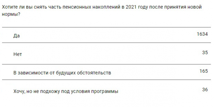 87 процентов опрошенных решили воспользоваться возможностью снятия накоплений после принятия новой нормы, девять процентов - будут принимать решение в зависимости от будущих обстоятельств. И только 35 читателей (два процента) не желают получать эти деньги. Еще 36 опрошенных отметили, что не подходят под условия программы.