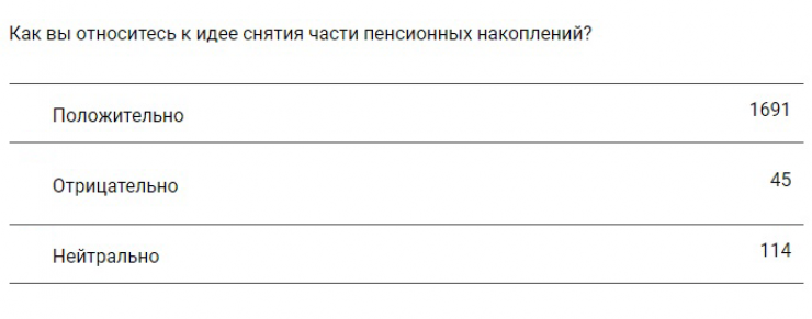 По результатам опроса большинство участников (91 процент) отметили, что положительно относятся к идее снятия части пенсионных накоплений. Три процента читателей высказались против, и шесть процентов голосов отдано варианту ответа "Нейтрально".