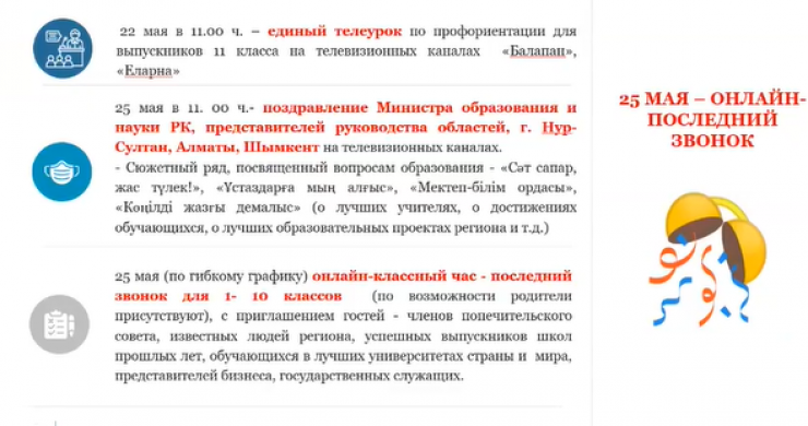 Шолпан Каринова отметила, что 25 мая ученики с 1-го по 10-й классы могут "встретиться" в онлайн-режиме. Для выпускных классов праздничное мероприятие пройдет 3-4 июня с соблюдением всех санитарных норм.