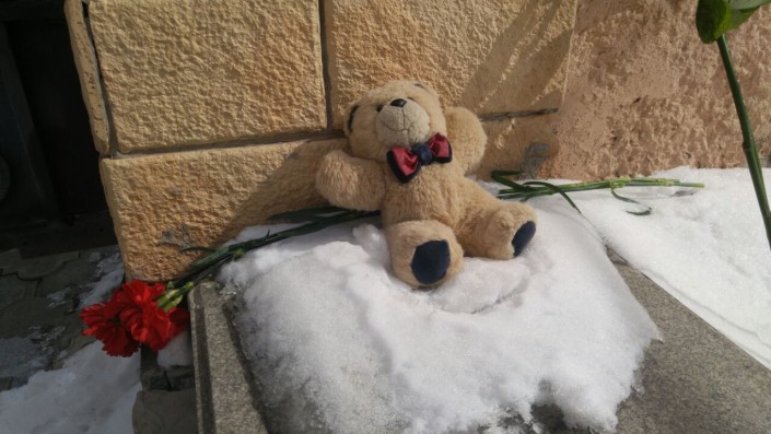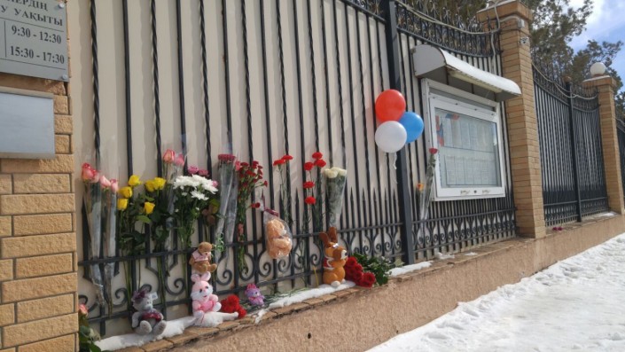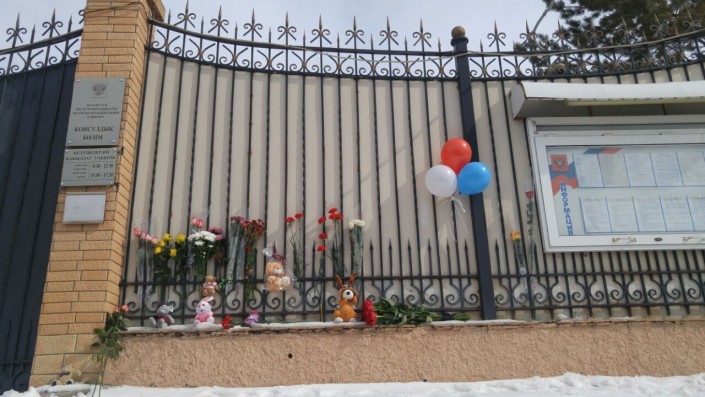 Со вчерашнего вечера к зданию посольства жители Астаны приносят цветы и мягкие игрушки в память о погибших.