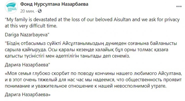 "Моя семья глубоко скорбит по поводу кончины нашего любимого Айсултана, и в этот очень тяжелый для нас час мы надеемся, что общественность проявит понимание и уважительное отношение к нашей невосполнимой утрате", - говорится в публикации.