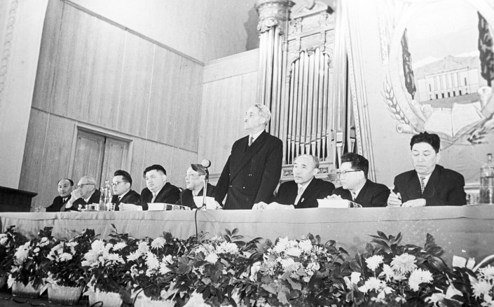 Декада казахской литературы и искусства. Константин Симонов во время открытия вечера. В президиуме (слева направо): математик Аскар Закарин; философ, специалист по проблемам национальных отношений в СССР, Нурымбек Джандильдин; писатель Мухтар Ауэзов; писатель Габит Мусрепов; государственные деятели Жумабек Ташенов; Амир Канапин; поэт Максим Рыльский. Москва, 1958 год.