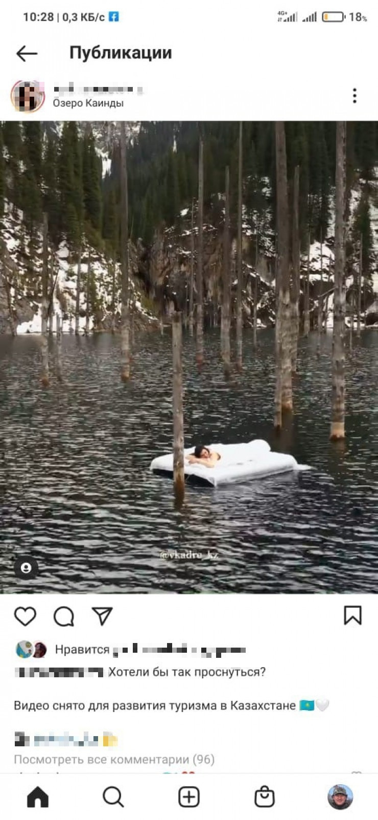 Видео девушки, проплывающей по озеру Каинды на надувном матрасе, выложили в Instagram.