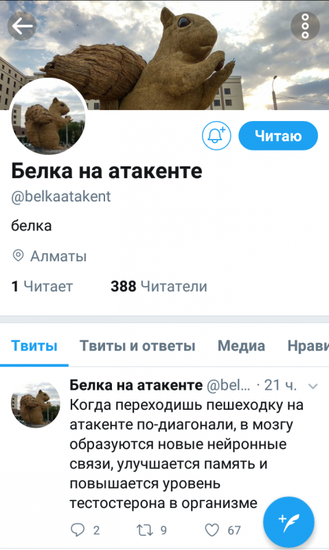 Twitter "Белка на Атакенте" неизвестные открыли три дня назад. Некто от имени арт-объекта обсуждает чемпионат мира, отвечает всем недоброжелателям, дерзит, жалуется на одиночество и погоду, требует ТВ и пишет свои мысли по поводу образования "новых нейронных связей и улучшения памяти".
