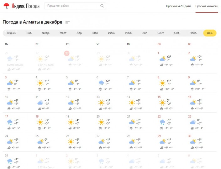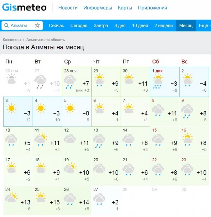 Между тем на сайте портала Gismeteo.kz сообщается, что декабрь в Алматы ожидается дождливым и теплым. Средняя температура воздуха составит +8...+9 градусов. 3, 4 и 5 декабря ожидается солнечная погода. 24, 25 и 26 декабря ожидается +13...+15 градусов.